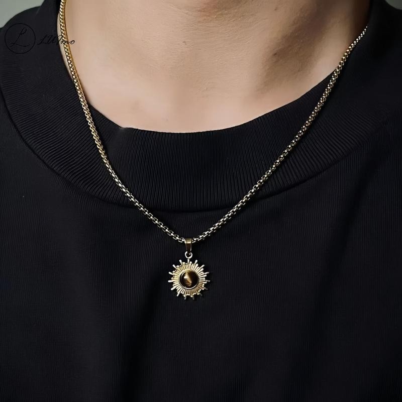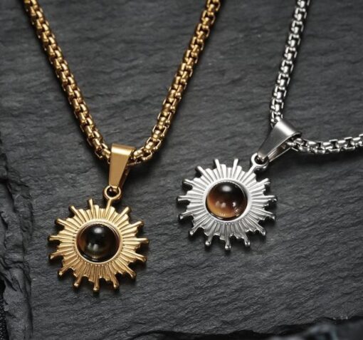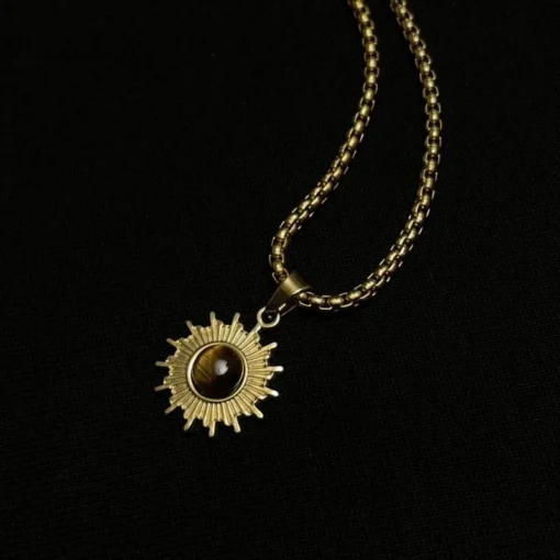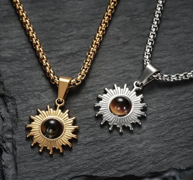 Thiết kế nổi bật như một mặt trời rực rỡ, dây chuyền kết hợp tinh xảo giữa titan và bạc, nổi bật với viên ngọc ở trung tâm như điểm nhấn đầy mê hoặc. Phù hợp cho cả phong cách tối giản lẫn cá tính – đây là món trang sức khơi dậy ánh nhìn và thể hiện năng lượng riêng biệt của bạn.